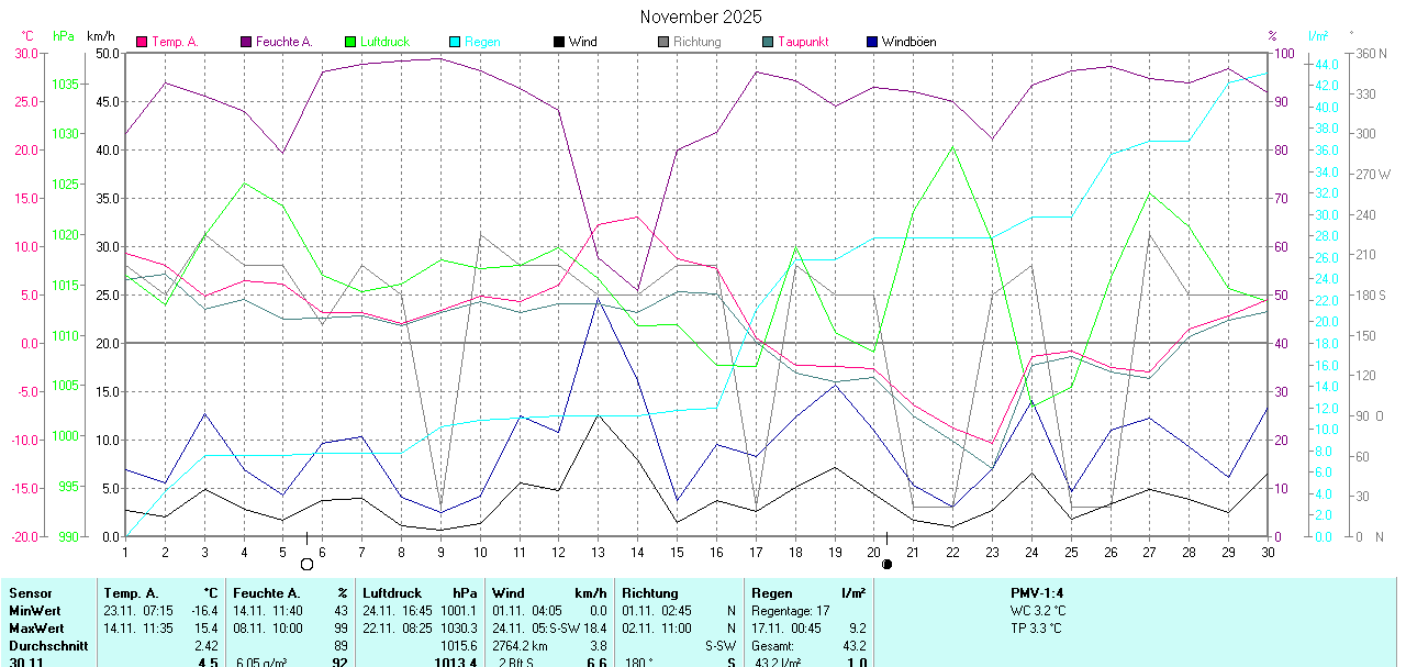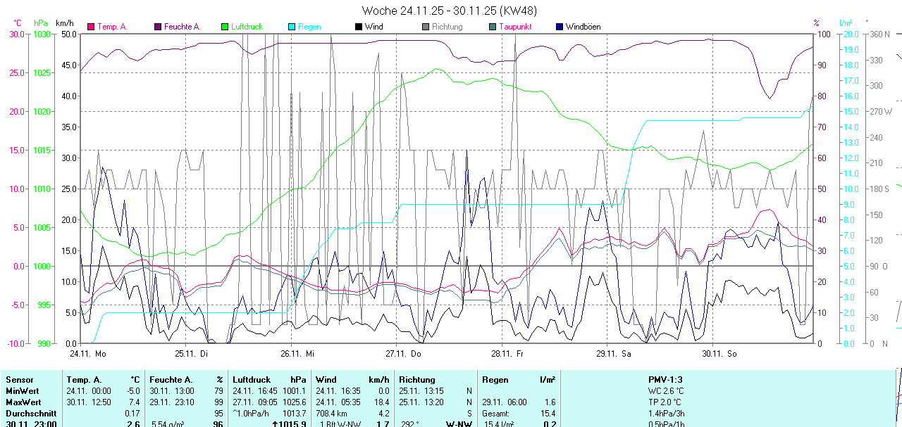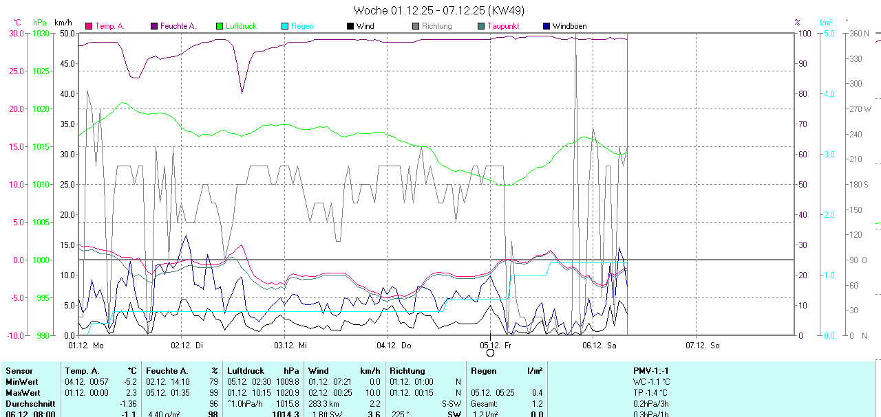 | Die dargestellten Werte repräsentieren die Daten der letzten 24 Stunden! Der Luftdruck ist auf Meereshöhe bezogen! |